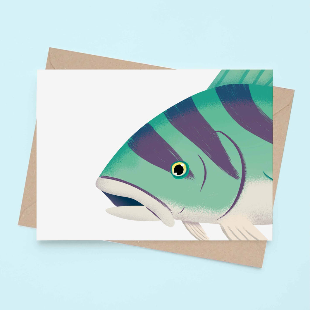 A beautifully illustrated roosterfish printed on an A6 greeting card
